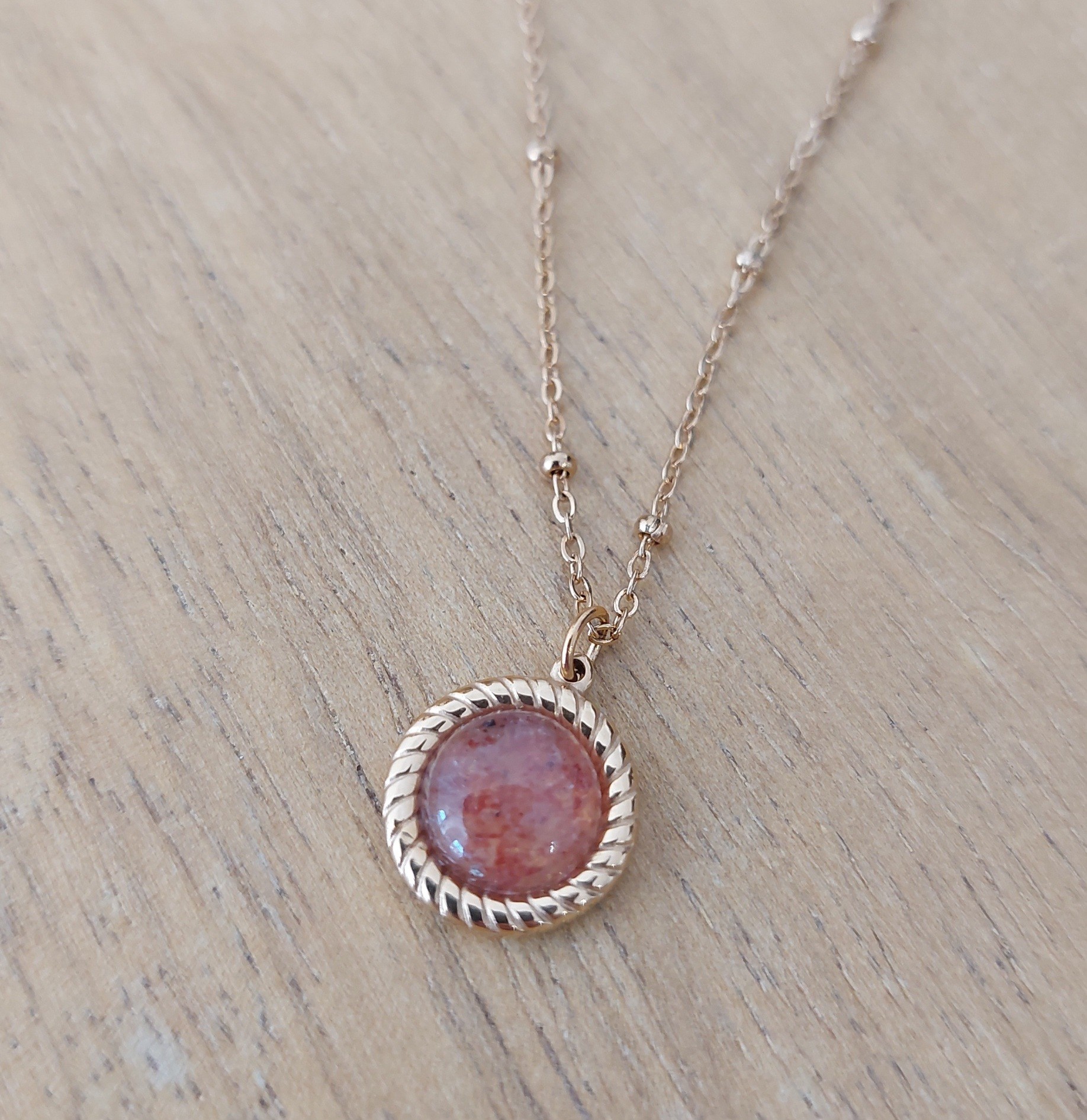 Sur ce collier, les pierres naturelles sont mises en valeur par le serti torsadé doré, pour un rendu lumineux et éclatant. • Résiste à l'eau • Fabriqué à la main Matière : Acier inoxydable doré et pierres naturelles Chaine : Perlée Longueur : 45 cm (mi-long) Taille de la pierre : 0,8 cm Taille du pendentif : 1,1 cm