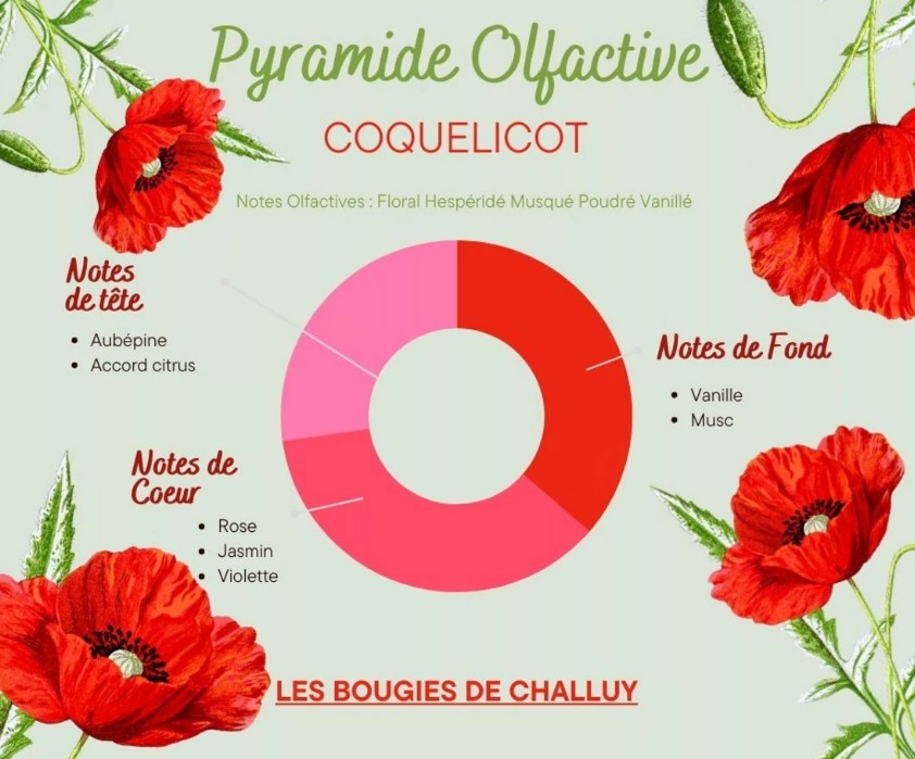 La Bougie au "Coquelicot" plongez-vous dans un champs avec des centaines de Coquelicots, une belle journée ensoleillée, un vent léger... Vous serez envoûter par ses notes florales, hespéridées, musquées, poudrées et vanillées.