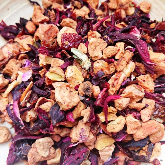 Ingrédients* : Pomme, hibiscus, cynorhodon, arôme naturel, fraise (2%), pétales de rose, vanille bourbon