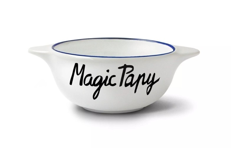 Magic papy Incontournable monument du kitsch régional, le fameux bol breton nous présente les nouveaux membres de sa famille recomposée. Les prénoms habituels cèdent leurs places à des messages actuels et amusants. À offrir sans modération pour s’éclater au petit-déjeuner ! Dimensions : Diam : 12 cm – ht : 6 cm – 30cl Matière : Faïence, filet bleu peint-main Impression : Émail cuit à très haute température – décors inaltérable Entretien : Lave-vaisselle ok – Micro-onde avec modération
