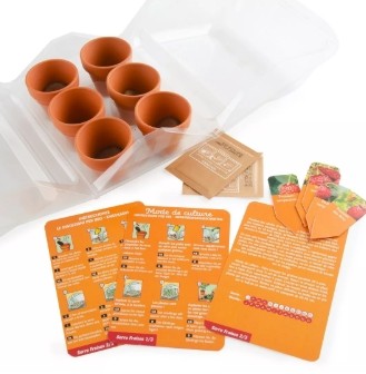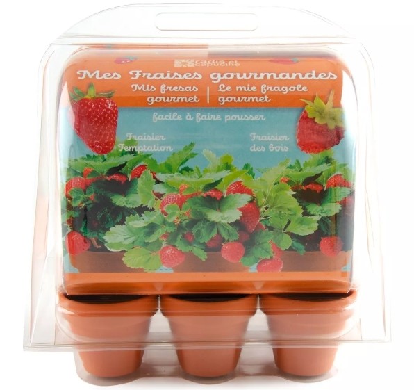 La mini-serre fraisiers va faire l’unanimité chez tous les gourmands. 6 petits pots de terre pour faire pousser 6 plants de fraisiers, voilà un bon départ pour une belle production de fruits juteux et sucrés. Une mini-serre en plastique PET recyclé 6 pots de terre cuite de 5 cm de diamètre 6 pastilles de terre de coco de 3 cm de diamètre 1 sachet de semences de fraisiers des bois et 1 sachet de semences de fraisiers temptation A faire à tout moment de l’année, d’abord en intérieur, avant de sortir les plants dehors, à partir du mois de mai.