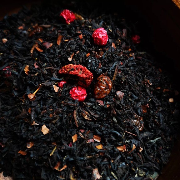 Ingrédients* : Thé noir Assam-Inde du Sud, Raison (raisin, huile végétale), écorces de cacao, arôme naturel, aronia, framboise, groseille, fraise