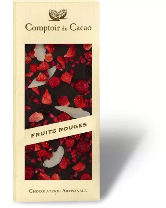 Notre chocolat noir 72% de cacao, a un puissant goût de cacao torréfié soutenu par une amertume intense. Les fèves de cacao de variété Forastero proviennent d'Afrique de l'ouest principalement. Cette tablette gourmande est également composée de fruits rouges séchés (fraise, framboise, groseille, myrtille) et de lamelle de noix de coco. Poids net 100g