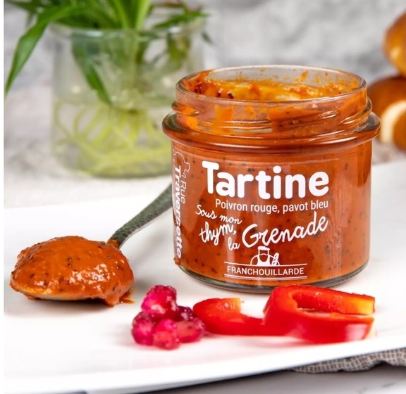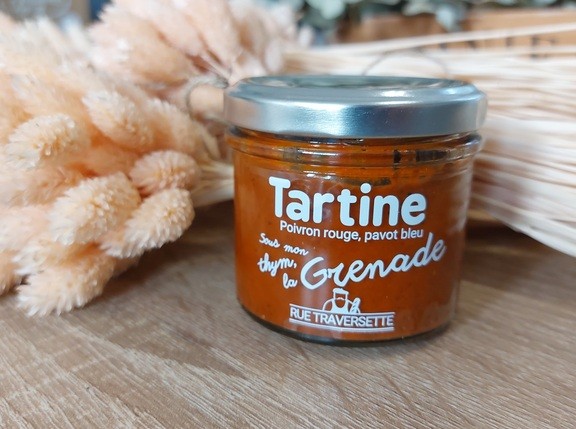 Ingrédients : poivron rouge (72%), jus de grenade (11%), oignon, huile d’olive, ail, miel, sel, thym (0,21%), graine de pavot bleu (0,03%).
